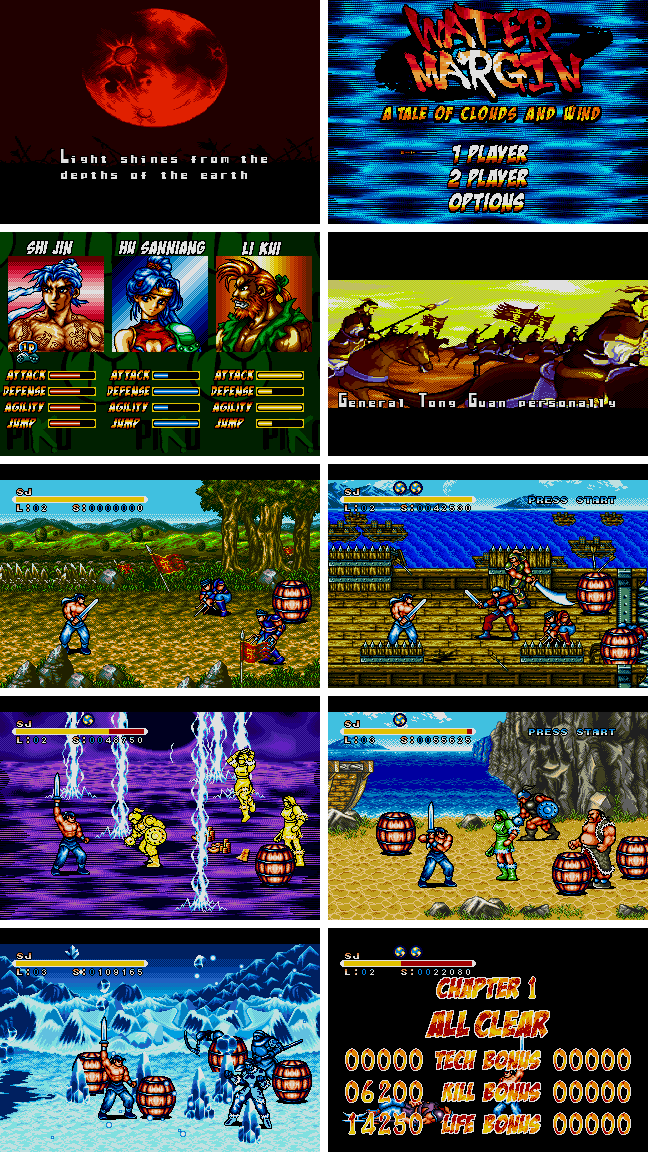 Water Margin features several different alternate endings depending the character and the difficulty you play the game through. It features different power ups and colorful 16 bit graphics. You can play two players simultaneously or pass through the game solo.